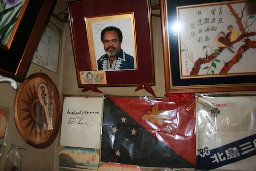 - 所狭しと並ぶパプアグッズ。奥写真がマイケル・ソマレ首相