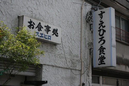 路地に入るとすぐに、白い壁のすえひろ食堂はありました。